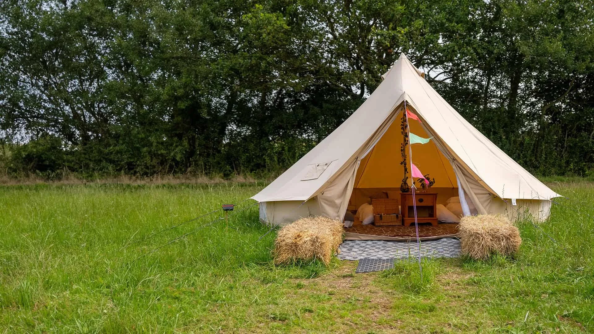 A group of people sitting on camping chairs and hay bales in a grassy field during daytime, with tents and trees in the background, having a outdoor gathering or picnic.